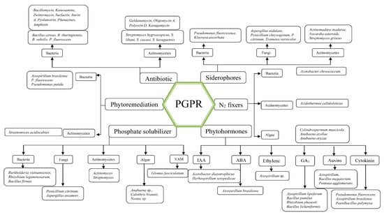 Phytoremediation is an energy proficient and cheap method of detoxification. Plant metabolism is influenced by reducing the metal bioavailability by absorbing them in the biomass of shoot []. Heavy metal phytoremediation is performed using PGPR. Agricultural activities and industrialization are the major reasons for metal contamination. Metal contamination of soil has a significant bearing on PGPR capacities. Upkeeping of metal homeostasis opposition in bacteria is achieved via the synthesis of binding proteins, sequestration, detoxification, reduced uptake, and active efflux []. Singh et al. [] revealed that heavy metal contamination of soil caused the blocking of functional molecules, essential components dislodging in biomolecules, alteration of structure, and function of enzymes/protein. Heavy metals additionally repress biochemical processes, such as respiration and photosynthesis, resulting in a reduction of growth. The proliferation of root hair and drastic expansion of the surface area of root resulted after the inoculation of maize with Azospirillum brasilense []. Intense heavy metal tolerant Pseudomonas putida, and P. fluorescens PGPR have been successfully assessed under states of contaminated soils and hyperosmolarity []. In addition to PGPR, a significant part of phytoremediation is performed by mycorrhizal fungi []. Streptomyces acidiscabies E13 strain applies positive growth developing effects in nickel contaminated soil of cowpea most likely by producing hydroxamate siderophores and binding of iron and nickel [].