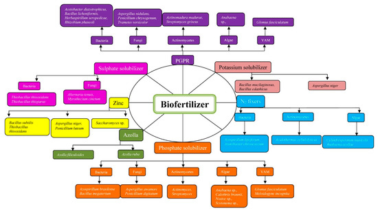 For a healthy environment, the management of integrated nutrient systems and sustained agricultural productivity is greatly influenced by microbial inoculants []. Microbial inoculants or biofertilizers contain living microorganisms that colonize the rhizosphere and helps in the promotion of plant growth. The converts the insoluble elements in the soil to a soluble form by a biological process similar to rock phosphate solubilization and nitrogen fixation []. Beneficial microorganisms utilized in biofertilizers improve microflora, soil health, plant growth, plant disease control, and protect the plant from pests []. There are beneficial microbial inoculants, such as nitrogen fixer, phosphate, sulfur, zinc solubilizer (VAM), and plant growth-promoting rhizobacteria, in biofertilizers. Plant growth-promoting rhizobacteria are bacteria that live freely on rhizosphere soil and promote plant growth. They also acts as biopesticides, based upon the ability or behavior of the crops and biocontrol agents (Nitrogen fixer, PSB, and SSB) [].