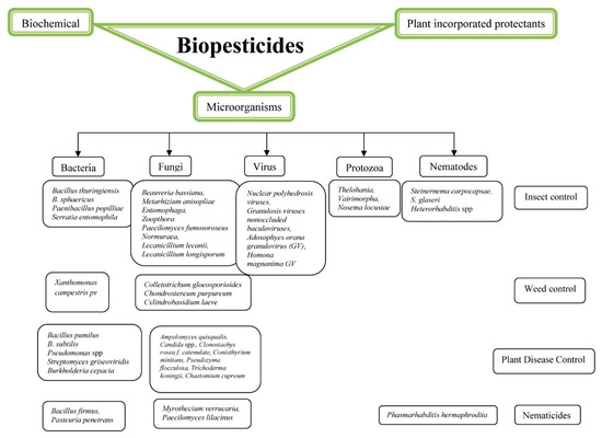 Compared to conventional pesticides, biopesticides pose less risk to humans and the environment, gaining global attention as a new instrument for destroying or controlling pest species such as weeds, plant diseases, and insects [,]. Most biopesticides are advantageous for non-target biological safety and higher selectivity []. Biopesticides are types of pesticides that are produced from naturally occurring substances that control pests in an eco-friendly way via nontoxic mechanisms. Microorganism-derived biopesticides (Nucleopolyhedrosis virus and Bacillus thuringiensis, Trichoderma), plants (Azadirachta and Chrysanthemum), and animals (nematodes) contain their products (microbial products and phytochemicals) or by-products (semiochemicals) and live species (natural enemies) []. Biopesticides are categorized into three main categories: (i) pest-controlled microorganisms (microbial pesticides), (ii) naturally occurring pest-controlled substances (biochemical pesticides), and (iii) plant-controlled pesticides with added genetic material (PIPs). The use of biopesticides has increased by about 10% each year globally []. Biopesticides are natural or organically inferred agents, applied similarly to chemical pesticides, but accomplish environment-friendly pest management. All pest management products, particularly microbial agents, are helpful in control but need to be correctly formulated and used [] (Figure 3 and Table 1 and Table 6).