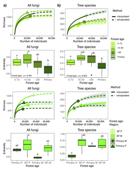 Figure 1. (a) Hill’s N0 interpolated and extrapolated richness across different stand age classes. Unbroken and dashed parts of the curve denote interpolated and extrapolated values, respectively, and the shaded zone around each curve denotes the 95% confidence intervals. Comparison of compositional turnover (β-diversity) of fungal and tree communities of early- (5–15 y), mid- (15–30 y), and late-successional (> 30 y) and primary forests based on normalized matrices. (b) Hill’s N0 interpolated and extrapolated richness across different stand age classes and compositional turnover (β-diversity) of fungal and tree communities in secondary forests (SF) and primary forests and between geographic regions, Piro (P) and Mogos (M). β-diversity was calculated as an abundance-based Jaccard similarity index. Means were compared using ANOVA and Tukey’s HSD tests, with letters denoting significant differences within each boxplot.