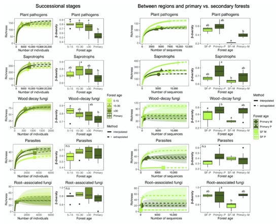 Figure 2. Hill’s N0 interpolated and extrapolated richness values of fungal functional groups across different stand age classes in both regions combined and in primary and all secondary forests (SF) between geographic regions two regions, Piro (P) and Mogos (M). Unbroken and dashed parts of the curve denote interpolated and extrapolated values, respectively, and the shaded zone around each curve denotes the 95% confidence intervals. Boxplots show compositional turnover (β-diversity) of the various functional groups among samples within forest types, calculated as abundance-based Jaccard similarity index. Means were compared using ANOVA and Tukey’s HSD tests, with letters denoting significant differences within each boxplot.