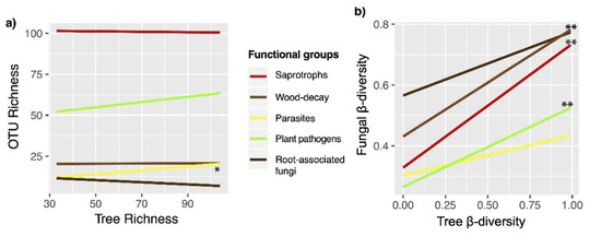 Figure 3. (a) Correlation between fungal OTU richness and tree richness (b) correlation between fungal β-diversity and tree β-diversity across primary and regenerating secondary forest sites in Costa Rica. Significance levels of correlation are: * = p ≤ 0.05 and ** = p ≤ 0.01.