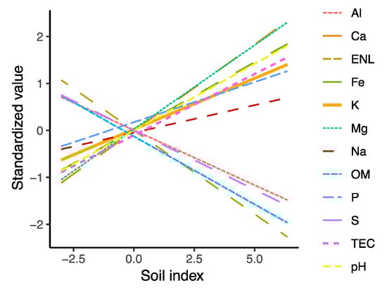 Figure 5. Correlation of soil chemical variables with soil index. Soil index is represented by an index based on ordination scores on the first axis of a principal component analysis (PCA) of all environmental variables.
