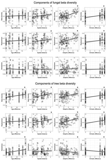 Figure 6. Correlation of total β-diversity and its replacement and nestedness components fungal and tree communities with pairwise differences in environmental factors among the sites. Significant correlations are indicated by asterisk *.