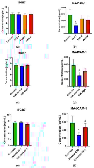 The levels of ITGB7 and MadCAM-1 in terms of PASI scoring, & means the existence of a trend between controls and PASI I subpopulation. p = 0.12 (a,b), BMI, & means the existence of a trend between controls and PASI I subpopulation. p = 0.11 (c,d), and CRP, * means p < 0.05 when comparing controls to normal CRP subgroup. p = 0.035, & means the existence of a trend between normal and elevated CRP subpopulation. p = 0.066 (e,f) allocations in psoriatic patients subgroups. PASI, psoriasis area and severity index; CRP, C-reactive protein; BMI, body mass index.