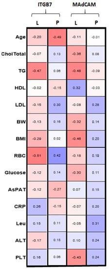 Correlations between ITGB7 and MAdCAM-1 concentrations and other parameters in patients with PSO (P) and LP (L). RBC, red blood cells; PLT, platelets; LEU, white blood cells; TG, triglycerides; HDL, high-density lipoprotein; LDL, low-density lipoprotein; CRP, C-reactive protein; ALT, alanine transaminase; AST, asparagine transaminase.