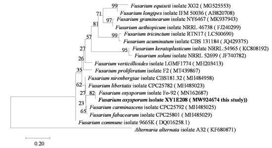 We used a molecular evolutionary genetics analysis (MEGA7.0) program to perform a phylogenetic analysis based on the TEF-1α gene sequence. The basic local alignment search tool (BLAST-N) software (http://blast.ncbi.nlm.nih.gov, 7 October 2021) was used to compare the sequences with other sequences of the genus Fusarium from the national biotechnology information center (NCBI). The alignment analysis was carried out using MEGA7.0 software. The phylogenetic tree was constructed using a data analysis model and the adjacency method (neighbor-joining). The bootstrap support value (bootstrap) was 1000. In the phylogenetic tree, the strain XY1E208 was in the same branch as F. oxysporum, being isolated from other Fusarium species (Figure 1). Therefore, the gene sequence of TEF-1α could be used to distinguish different species of F. oxysporum. We determined the base sequence of TEF-1a using a conserved region of F. oxysporum and used ClustalX software to compare and analyze the base sequence of the TEF-1α gene between different species of Fusarium and other pathogens.