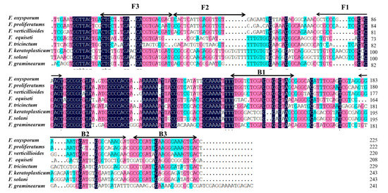 LAMP primers were designed according to partial TEF-1α gene sequences as species-specific primers with primer explorer V5 software (http://primerexplorer.jp/e/, 13 May 2021). Six LAMP primers are shown in Figure 2 and listed in Table 2, including two external primers (F3 and B3), two internal primers (FIP and BIP), and two loop primers (F-loop and B-loop). The primers were synthesized by Sangon Biological Engineering Co., LTD (Shanghai, China) and then repackaged with ddH2O after being dissolved and stored at 4 °C.
