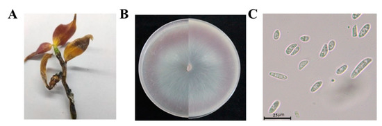Isolation of pathogenic fungi from soft rot in Dendrobium officinale. (A) = The soft rot on Dendrobium officinale plant in the field; (B) = the morphology of strain XY1E208 after growing on PDA medium for 7 days; (C) = conidia morphology of strain XI1E208.