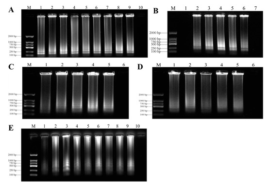 Optimization of LAMP assays. (A) = Optimization of LAMP reaction temperature for detection of F. oxysporum. Lane M, Ds 2000 DNA molecular weight marker ladder; Lane 1, 55 °C; Lane 2, 58 °C; Lane 3, 60 °C; Lane 4, 62 °C; Lane 5, 64 °C; Lane 6, 65 °C; Lane 7, 66 °C; Lane 8, 68 °C; Lane 9, 70 °C; Lane 10, negative control. (B) = Optimization of LAMP reaction time for detection of F. oxysporum. Lane M, Ds 2000 DNA molecular weight marker ladder; Lane 1, 15 min; Lane 2, 30 min; Lane 3, 45 min; Lane 4, 60 min; Lane 5, 75 min; Lane 6, 90 min; Lane 7, negative control. (C) = Optimization of LAMP reaction inner primer (FIP/BIP) concentration for detection of F. oxysporum. Lane M, Ds 2000 DNA molecular weight marker ladder; Lane 1, 0.4 μM; Lane 2, 0.8 μM; Lane 3, 1.2 μM; Lane 4, 1.6 μM; Lane 5, 2 μM; Lane 6, negative control. (D) = Optimization of LAMP reaction outer primer (F3/B3) concentration for detection of F. oxysporum. Lane M, Ds 2000 DNA molecular weight marker ladder; Lane 1, 0.2 μM; Lane 2, 0.4 μM; Lane 3, 0.6 μM; Lane 4, 0.8 μM; Lane 5, 1 μM; Lane 6, negative control. (E) = Optimization of LAMP reaction Mg2+ concentrations for detection of F. oxysporum. Lane M, Ds 2000 DNA molecular weight marker ladder; Lane 1, 2 mM; Lane 2, 3 mM; Lane 3, 4 mM; Lane 4, 5 mM; Lane 5, 6 mM; Lane 6, 7 mM; Lane 7, 8 mM; Lane 8, 9 mM; Lane 9, 10 mM; Lane 10, negative control.