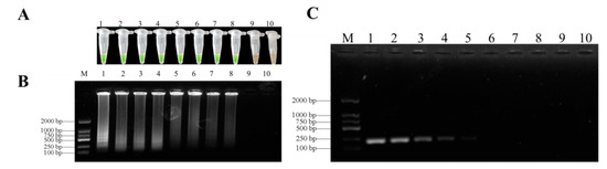 The limits of the LAMP assays were evaluated with a series of concentrations (10–1–10–9 ng/μL) of F. oxysporum DNA template based on partial TEF-1α gene sequences under optimized reaction conditions. The limit of LAMP assays was 5 fg/μL for the genomic DNA of F. oxysporum in D. officinale (Figure 6A,B). However, the sensitivity of conventional PCR was every 25 μL system of F. oxysporum DNA purified by 5 pg/µL (Figure 6C). Therefore, the LAMP assays were more sensitive than conventional PCR assays.