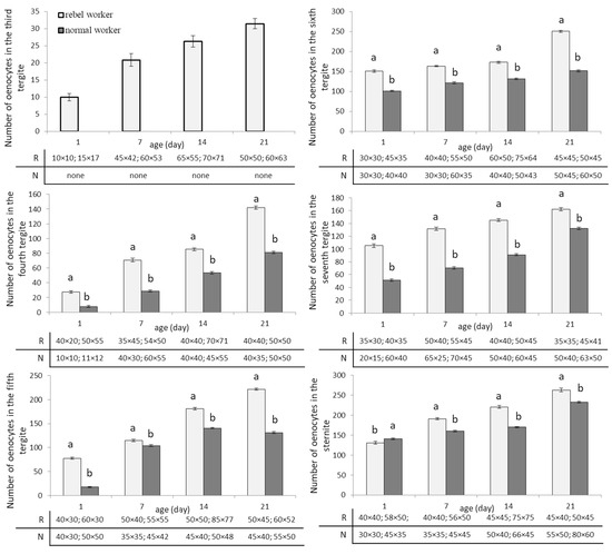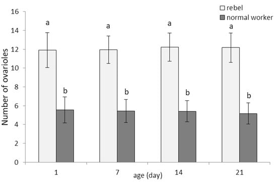 Number of ovarioles (mean ± SD) in normal workers and rebels. Lowercase letters indicate significant differences between averages for the rebels and normal workers within a specific age with p < 0.01; No. of rebels = 60; no. of normal workers = 60.