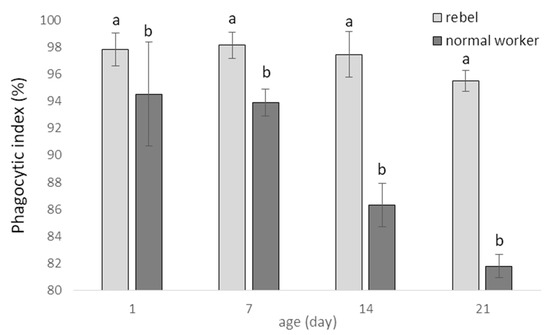 Phagocytic index (%; mean ± SD) in hemolymph of normal workers and rebels. Lowercase letters indicate significant differences between averages for the rebels and normal workers within a specific age with p < 0.01; No. of rebels = 60; no. of normal workers = 60.