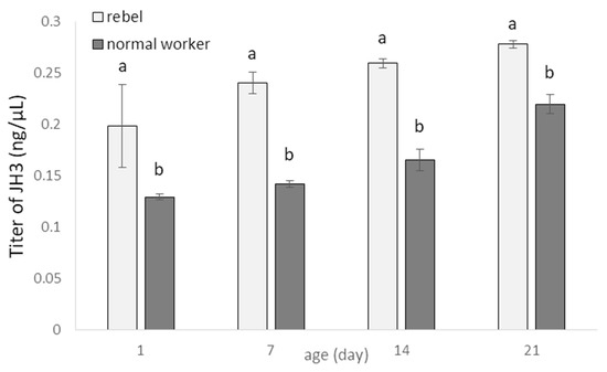 Juvenile hormone (JH3; mean ± SD) titers in hemolymph of normal workers and rebels. Lowercase letters indicate significant differences between castes/sub-caste within a specific age with p < 0.01; No. of rebels = 60; no. of normal workers = 60.