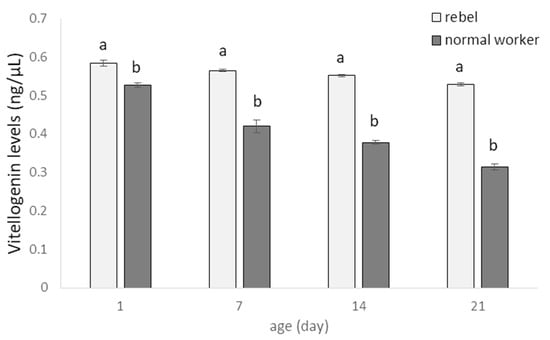 Vitellogenin levels (mean ± SD) in hemolymph of normal workers and rebels. Lowercase letters indicate significant differences between averages for the rebels and normal workers within a specific age with p < 0.01; No. of rebels = 60; no. of normal workers = 60.