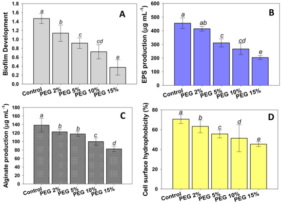 Like other biofilm traits, the production of alginate by strain PAB19 was diminished by increasing PEG concentrations. Minimum production (82.3 µg mL−1) of alginate was recorded at a PEG concentration of 15% (Figure 2C). Cell surface hydrophobicity (CSH; the adhesion of bacterial cells to hydrocarbons) of strain PAB19 was reduced by increasing the levels of water stress, and PEG at a concentration of 15% maximally reduced CSH by 36% versus non-treated controls (70.6%) (Figure 2D). Bacterial cell surface hydrophobicity is linked to bacterial cell aggregation and adhesion, as well as biofilm formation, and as a result, excessive levels of water stress may impede bacterial colonization behavior [80]. The formation of biofilms and the production of associated traits at high PEG concentrations is a clear indication that the PAB19 strain can withstand severe drought stress, indicating drought tolerance may protect developing bacterial cells and improve survival and activity under water stress.