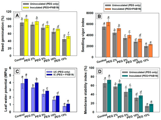 The efficiency of V. radiata seed germination in pot soils amended with different doses of PEG and inoculated with PAB19 was recorded at 6 DAS. Almost all seeds planted in untreated soil germinated, whereas PEG at 15% maximally retarded germination efficiency and SVI by 50 and 56%, respectively, over non-treated controls. However, inoculation of strain PAB19 improved seed germination and the vigor index of V. radiata by mitigating water-induced stress (Figure 3A,B). Likewise, the seed germination efficiency of Astragalus caraganae grown under water stress was increased following the inoculation of drought-tolerant PGPR strains viz., A. lipoferum, A. chroococcum, P. aeruginosa, and B. cereus [81]. Additionally, the combined inoculation of drought-tolerant species such as Mesorhizobium ciceri, with ACC deaminase positive Bacillus sp. and Pseudomonas strain 6-P, mitigate the drought stress and simultaneously enhance the growth of Cicer arietinum under axenic conditions. It was observed that seedlings with higher osmotic potential (up to 0.4 MPa) had considerably enhanced germination, root and shoot length, and fresh weight compared to non-inoculated control [82].