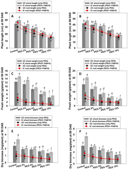 Impact of the bio-inoculation of Enterobacter sp./L. adecarboxylata PAB19 on biological features; plant length at 50 DAS (A) and 80 DAS (B), fresh weight at 50 DAS (C) and 80 DAS (D), dry biomass at 50 DAS (E) and 80 DAS (F) of V. radiata (L.) cultivated under different levels of water stress (2%, 5%, 10% and 15% PEG-6000) under greenhouse conditions. Bar diagrams represent the mean values of three replicates. Mean values followed by different letters are significantly different (p ≤ 0.05) as determined by the DMRT. Bar and scatter plots represent means ± SDs.