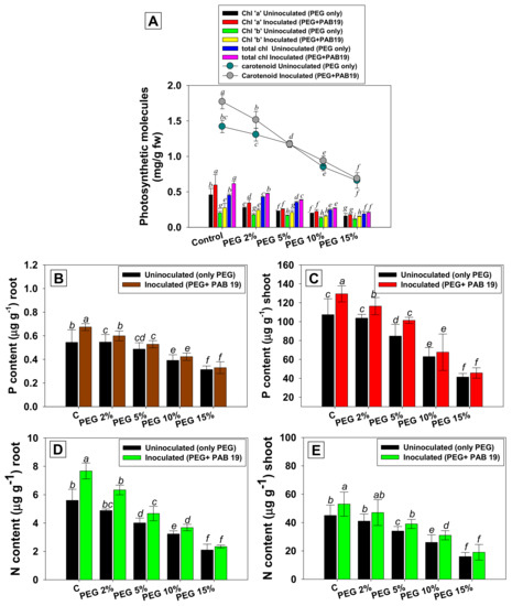 Leaf pigments (Chl a, Chl b, total chlorophyll, and carotenoid) in the foliage of strain PAB19 inoculated and PEG-treated V. radiata were extracted and quantified [38,39] (refer to Section S2.6.4). Nutrient (N and P) uptake by PGPR inoculated and PEG-treated V. radiata were analyzed as described by Jackson et al. [40] and Lindner et al. [41], respectively. For estimation of N content, a 10 mL aliquot of digested roots and shoots samples were taken in a 50 mL volumetric flask. To this, 2.0 mL of 2.5 N sodium hydroxide (NaOH) and 1.0 mL of 10% sodium silicate solution were added to neutralize the access of acidity and to prevent turbidity, respectively. The volumetric flask was filled up to the mark of 50 mL by DDW. In a 10 mL graduated test tube, 5.0 mL aliquot of this solution was taken, and 0.5 mL Nessler’s reagent was added allowed to stand for 5 min for color development. The absorbance was read at 525 nm and N content was calculated using the standard curve. For P estimation, one gram of dried samples was digested in nitric acid and perchloric acid prepared in a ratio of 4:1. Then, 5.0 mL of acid digested sample was mixed with 5.0 mL of vanadomolybdate reagent. The volume was made to 25 mL with DDW. The solution was incubated for 30 min until the formation of yellow color. Absorbance was measured at 470 nm.
