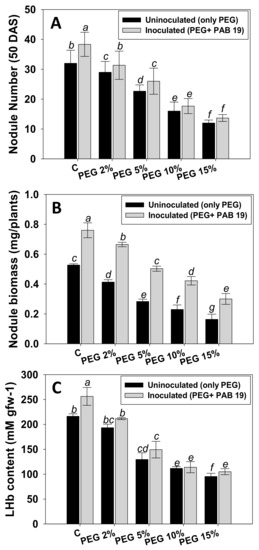 Nodule numbers, dry biomass, and LHb contents of V. radiata were maximally reduced by 62%, 69%, and 56%, respectively, in the presence of 15% PEG at 50 DAS (Figure 6). However, inoculation of PAB19 considerably increased these symbiotic features of plants cultivated in water-stressed soils. For example, PAB19 greatly enhanced nodule numbers, biomass, and LHb content by 10%, 38%, and 9%, respectively, in the presence of a 2% PEG at 50 DAS (Figure 6A–C). Nodule number was found to be strongly correlated with nodule biomass LHb content (R2 = 0.89 and 0.85, respectively). The data suggest that PEG-induced decrease in symbiotic efficiency (number, biomass, and LHb content of nodule) of V. radiata was reversed by increased nodulation following the inoculation of drought tolerating, IAA-synthesizing, and other bio-molecule-producing PAB19. It is also suggested that through both local and systemic hormone signaling, successful deployment of bacteria in the V. radiata rhizosphere enhanced plants’ symbiotic attributes. Similarly, in a previous study, drought-tolerant PGPR strains recovered from the root nodules of mung bean improved nodulation, and the symbiotic features of V. radiata raised under abiotic stress conditions [92]. Corroborating our results, inoculation of Pisum sativum (pea) plants growing in dried soils with ACC deaminase producing PGPR strain Variovorax paradoxus 5C-2 improved the plant growth [93]. They claimed that bacterized plants showed more seed yield, seed number, and seed nitrogen accumulation and restored nodulation which was repressed in drought stress conditions. Co-inoculation of P. vulgaris L. (common bean) with drought tolerating PGPR strains (Rhizobium tropici CIAT 899, P. polymyxa DSM36, and P. polymyxa Loutit), resulted in higher growth and nodulation relative to plant raised in soil treated only with drought stressor (PEG) [94].