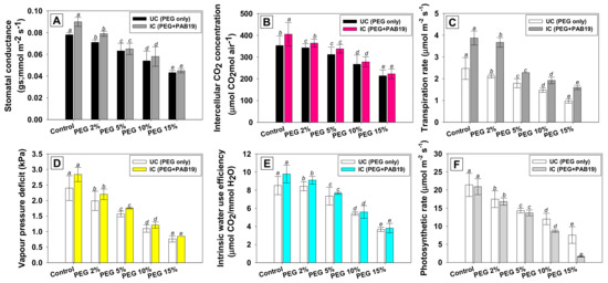 The gas exchange parameters of strain PAB19 inoculated and PEG-treated V. radiata foliage were also evaluated. Stomatal conductance (gs), rate of transpiration €, internal CO2 concentration (Ci), net photosynthetic rate (PN), and vapor pressure deficit (kPa) were measured using a Li-COR 6400 portable photosynthesis system (Li-COR, Lincoln, NE, USA).