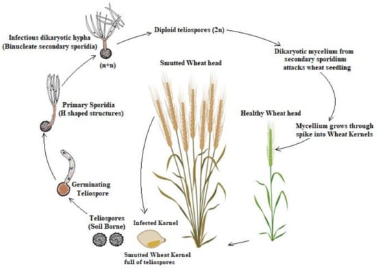 The mature teliospore is in a diploid (2n) form, and meiotically after germination, divides the nucleus and then it produces the haploid primary sporidia mitotically. Fuentes and Duran [19] reported that meiosis happens during germination, followed by a series of mitosis in teliospores and promycelia, forming multiple haploid nuclei in the promycelia. The disease cycle of this pathogen occurs in three morphologically distinct forms, as shown in Figure 1. These forms are: a haploid nonpathogenic phase that grow as sporidal form. Primary sporidia germinates to produce an infectious and reproductive entity, i.e., allantoid and filiform secondary sporidia, respectively; filamentous dikaryon which is produced after the fusion of two pathogenic compatible haploid cells that colonize in the plant tissues; diploid teliospore that resulted from karyogamy in sporogenous mycelium in host tissues. Then, the secondary sporidia arrive on host florets during the germination and penetrate its lemmas, glumes, paleas and rachis via stomata. The originated spores are capable of surviving in soil, wheat straw and manure in farmyards for many years [20].