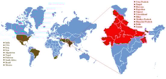 Countries with incidence of Karnal Bunt disease as reported till 2020. Distribution of infected countries (shown in brown) and states within India (shown in red). The KB positive states are indicated in red as per survey report of ICAR-IIWBR, Karnal, 2019).