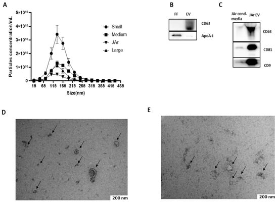 FF EVs and JAr EVs were characterized by nanoparticle tracking analysis (NTA), Western blot (WB) and transmission electron microscopy (TEM). Mostly, the nanoparticles as analyzed by NTA were less than 350 nm in size, with a large population in the 50–250 nm size range, which is the typical size range of EVs [43] NTA results suggest that the FF of small-sized follicles had a higher concentration of EVs than medium- and large-sized follicles (Figure 1A). Purified FF EVs and JAr EVs were analyzed by Western blot for specific EVs markers. Specific EVs markers were present in both FF EVs (CD63; Figure 1B) and JAr EVs (CD63, CD81, CD9; Figure 1C). Apolipoprotein A-I (apoA-I) was used as a marker for EV purity (Figure 1B). The TEM analysis visualized the presence of EVs with a typical cup-shaped morphological characteristic of EVs. Black arrows indicate the EVs (Figure 1D,E).