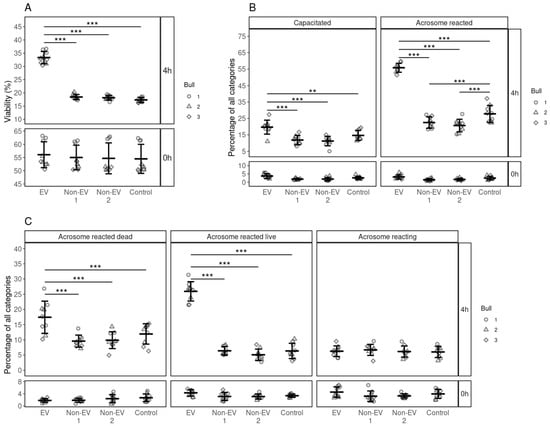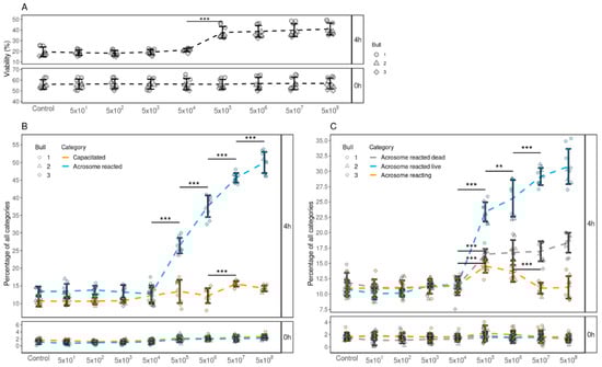 The effects of supplementing different concentrations of FF EVs (per 500 µL) on the viability, capacitation and acrosome reaction of spermatozoa. (A) The percentage of live spermatozoa supplemented with different EV concentrations at 0 and 4 h. (B) The percentages of spermatozoa at different stages of capacitation reaction 0 and 4 h after supplementation with different EV concentrations. (C) The percentages of spermatozoa in different stages of acrosomal reaction 0 and 4 h after supplementation. Error bars display the mean ± standard deviation (SD). In the background, different symbols represent measurements of samples from different bulls. Asterisks mark statistically significant differences between different concentrations and relate to p-values as follows: ** p ≤ 0.01; *** p ≤ 0.001. Whereas all pairwise comparisons were conducted, statistically significant differences are marked only for adjacent concentrations.