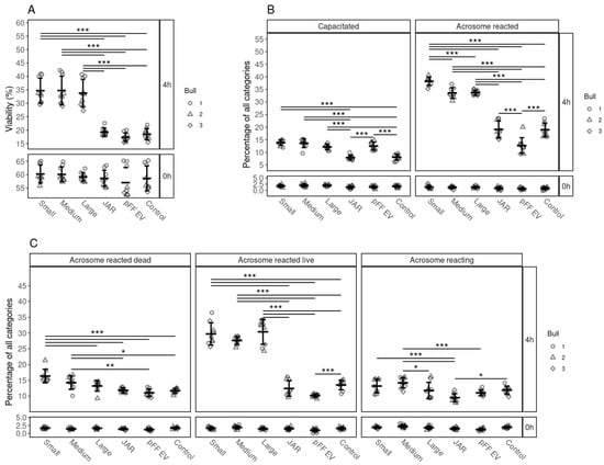 The effects of supplementation of EVs from different cellular sources on the viability, capacitation and acrosomal reaction of spermatozoa. (A) Percentages of live spermatozoa 0 and 4 h after supplementation with EVs from small, medium and large follicles, JAr EVs, pFF EVs and control. (B) Percentages of spermatozoa at different stages of capacitation reaction 0 and 4 h after supplementation with EVs from different sources. (C) Percentages of spermatozoa at different stages of the acrosomal reaction after supplementation with EV from different sources at 0 and 4 h. Error bars display the mean ± standard deviation (SD). Different symbols represent measurements of samples from different bulls. Asterisks mark statistically significant differences between the supplementation groups and relate to p-values as follows: * p ≤ 0.05; ** p ≤ 0.01; *** p ≤ 0.001. Double lines annotate p-values of the same category. In that case, asterisks above the top line also apply to the bottom line. The ends of the lines mark the groups that were contrasted.