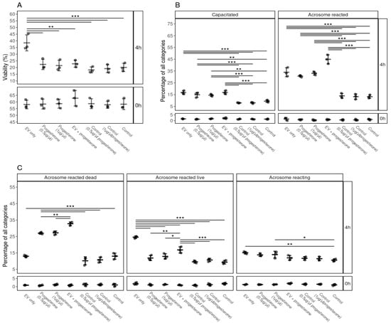 The effects of supplementation of EVs and different concentrations of progesterone and combination of FF EVs and progesterone on the viability, capacitation and acrosomal reaction of spermatozoa. (A) Percentages of live spermatozoa 0 and 4 h after supplementation with EVs, progesterone (0.5, 1 µg/µL), combination of FF EVs and progesterone, and controls. (B) Percentages of spermatozoa at different stages of capacitation reaction 0 and 4 h after with different supplementations. (C) Percentages of spermatozoa in different stages of the acrosomal reaction after supplementation with EV, different concentrations of progesterone and combinations of FF EVs and progesterone at 0 and 4 h. Error bars display the mean ± standard deviation (SD). Different symbols represent measurements of samples from different bulls. Asterisks mark statistically significant differences between the supplementation groups and relate to p-values as follows: * p ≤ 0.05; ** p ≤ 0.01; *** p ≤ 0.001. Double lines annotate p-values of the same category. In that case, asterisks above the top line also apply to the bottom line. The ends of the lines mark the groups that were contrasted.