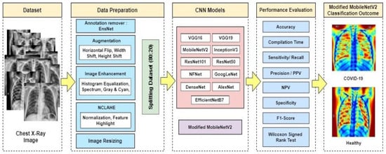 One of the main goals of this research is to obtain appropriate classification results utilizing freely available data (increased to high volume data by using enhancement techniques) with the combined transfer learning models. This research was undertaken to choose a CNN-based deep learning model that is appropriate for COVID-19 image classification investigation. The primary aim is to propose a modified novel deep-learning-based CNN model to gain the highest accuracy on a large volume of chest X-ray data with minimal compilation time and compare the modified novel approach (accuracy, efficiency, compilation time) with existing deep learning models on the same dataset. Figure 2 shows the system diagram of the experiment.