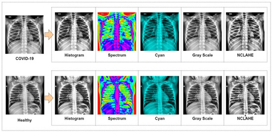 A chest X-ray database [57] was used to experiment with this study. This database is currently one of the popular public X-ray databases, containing 3616 COVID-19 cases along with 10,192 healthy, 6012 lung opacity and 1345 viral pneumonia images. However, only COVID-19 (3616) and healthy (10,192) X-ray images were extracted for this study. As a result, the dataset includes studies of COVID-19 and healthy individuals with a matrix resolution of 299 × 299 (two X-ray examples are shown in Figure 1). EnsNet [58], a system for scene-text removal, was used to remove annotations from certain images. EnsNet is capable of automatically removing all of the text or annotation from an image without any prior knowledge [59]. Data augmentation and image enhancement techniques are performed to enhance the quantity and variety of images given to the classifier for classification. Image augmentations used include horizontal flip, rotation, width shift and height shift on all the extracted data from the original dataset. As chest X-ray images are not vertically balanced, vertical flip was not applied. All augmentation parameters are shown in Table 2. After image augmentation, the dataset was increased to a larger dataset consisting of 26,000 COVID-19 and 26,000 healthy chest X-ray images. Besides, image enhancement applied Histogram equalization, Spectrum, Grays and Cyan. The N-CLAHE algorithm was then used to normalize pictures and highlight smaller features for machine learning classifiers to notice. Thereafter, the images were scaled down to the classifier’s standard resolution (for instance AlexNet was 256 × 256 pixels, whereas GoogLeNet was 224 × 224 pixels). After resizing the picture, the machine learning classifier used the enhanced (52,000) images in a ratio of 80% data for training, whereas 20% was used for testing. Table 3 shows the details of the dataset.