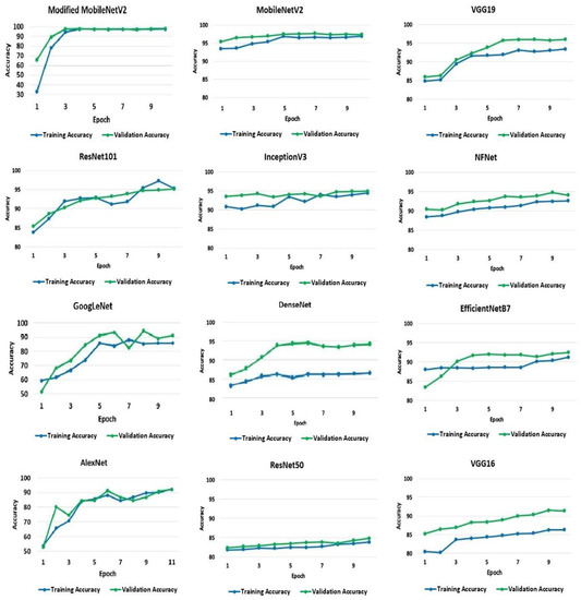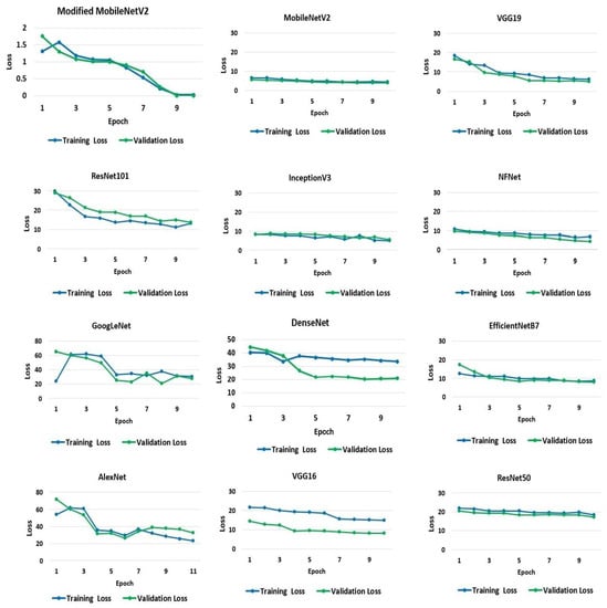 A model’s loss value indicates how well or badly it performs after each iteration, depending on the model. Less loss means higher performance, unless a model has been over-fitted to its training data. The loss experienced by the models throughout the training and testing processes is shown and quantified in Figure 5. On average, the rate of loss decreased as the number of epochs increased. The average loss varied significantly across models. However, the suggested modified MobileNetV2 model results in the smallest loss of 0.0039%. MobileNetV2 has the second-lowest loss rate at 4% and 3% for the training and validation sets, respectively. The most significant loss is seen in GoogLeNet, Dense-Net, and AlexNet. The GoogLeNet has a loss rate of 23% and 20% for the training and validation datasets, respectively. AlexNet demonstrates losses of 23% and 31% from training and validation data, respectively. DenseNet exhibits a loss rate of 33% and 20% from the training and validation sets, respectively.