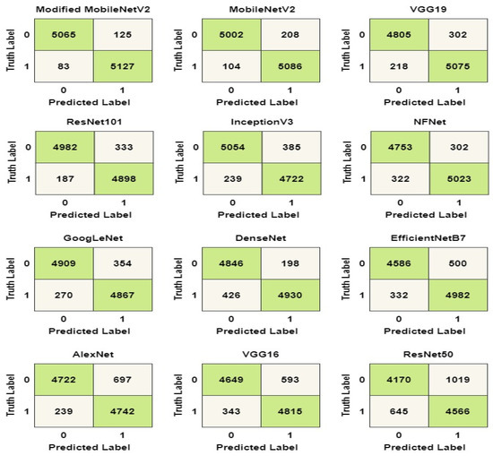 The confusion matrix for the models is shown in Figure 6 to aid in visualizing their overall performance. The test dataset contains 10,400 data samples, 5200 of which are COVID-19 samples and 5200 of which are healthy samples. COVID-19 and healthy instances are denoted by the labels ‘1’ and ‘0’, respectively. From the matrix, modified MobileNetV2 can successfully identify 5065 healthy samples and 5127 COVID-19 samples. In total, the model could accurately identify a total of 10,192 (98%) data samples from the test set. Similarly, MobileNetV2 models could accurately identify 5086 COVID-19 samples and 5002 healthy cases, amounting to 97% accuracy.