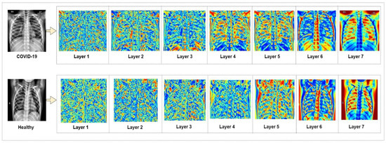 It is observed from the performance measure comparison that the suggested modified MobileNetV2 model shows superior performance compared to the pre-trained CNN models. The model successfully can identify and tell apart COVID-19 and healthy chest X-ray images. In Figure 7, a heat map is presented that shows the classification process of the suggested model at each level of its architecture.