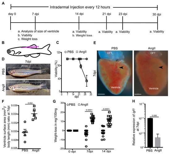 Previous studies have shown that AngII employment through an osmotic pump in rodents causes cardiac hypertrophy [50,51] and remodeling [52]. Since the osmotic pump delivery system is unavailable for zebrafish, we opted for intradermal injection, which ensures relatively slow drug release in the body and bloodstream from the injection site [53]. In rodents, an osmotic pump-based delivery of ~1 µg AngII/g body weight in 12 h for 2–3 weeks leads to pressure overload-induced cardiac hypertrophy [54,55]. Since we planned to inject every 12 h, in the place of osmotic pump-based continuous delivery, we employed a 50% higher dose than rats. Thus, to explore the effect of AngII on adult zebrafish, 1.5 µg AngII in PBS/g of zebrafish was injected intradermally every 12 h for a stipulated time (Figure 1A,B). Studies in rodents have reported AngII treatment for a maximum of up to 21 days, and none of those studies reported mortality [54,55,56,57]. Similarly, we found 100% viability in AngII or PBS injected zebrafish until 21 days post-injection (dpi) (n = 18 each from three independent experiments). However, around ~23% and ~67% mortality was observed in AngII injected zebrafish at 23 and 30 dpi, respectively (n = 18 each from three independent experiments) (Figure 1C).