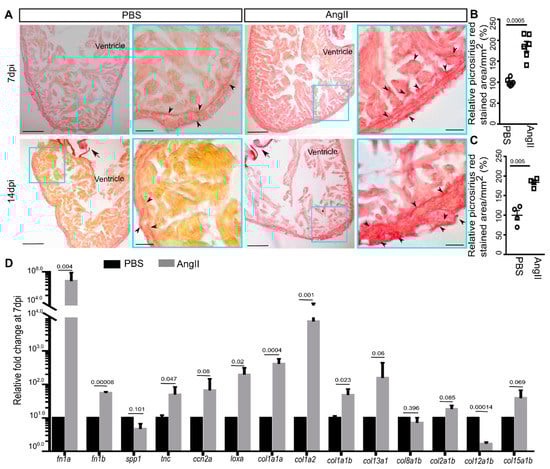 Hypertension leads to collagenous fibrosis in human hearts [3]. Cardiac fibrosis was also observed in AngII-induced hypertension in mice [60,61,62]. Since our model exhibited AngII-induced cardiac hypertrophy at 7 dpi, we further explored collagenous scars in cardiac ventricles at 7 and 14 dpi. Picrosirius red-stained sagittal wax sections of the ventricles from AngII injected 7 dpi, and 14 dpi animals showed interstitial fibrosis in the cardiac tissue compared to control hearts (Figure 2A). For analysis, bright-field images were quantified for picrosirius red-stained collagen enriched area/mm2 cardiac tissue. Quantitative analysis showed that compared to the PBS injected control, in the heart sections from AngII injected animals, ~85% and ~83% more area was collagen enriched at 7 and 14 dpi, respectively (n = 5 each from two independent experiments) (Figure 2B,C). Thus, our data indicate that AngII induces cardiac fibrosis in zebrafish.