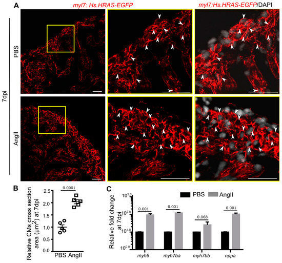 In mammals, AngII induces CM hypertrophy, fibrosis, and thus cardiac remodeling [31,50,52]. We observed cardiac hypertrophy in the AngII injected zebrafish (Figure 1E). Therefore, we explored the effect of AngII on the size of CMs at 7 dpi. The cross-section area of CMs was quantified using Tg(myl7:HsHRAS-EGFP) [46] animals that express EGFP in the CMs plasma membrane, facilitating analyzing CM morphology. Transverse sections through the cardiac ventricle were stained with anti-GFP and scanned under a confocal microscope. Single plane optical images showed a bigger cross-sectional area of the CMs in the cortical myocardium of the heart from AngII injected zebrafish compared to PBS injected control (Figure 3A). Quantitative analysis showed that CMs from AngII injected animals are ~2 times larger than the control hearts at 7 dpi (n = 5 from two independent experiments) (Figure 3B), suggesting AngII induces CM hypertrophy in zebrafish.