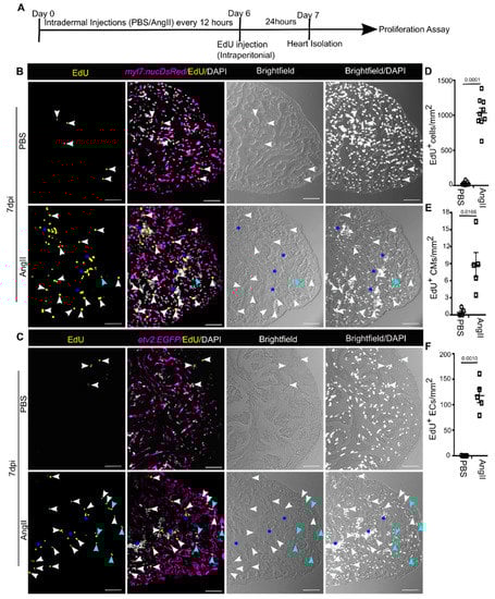 In vitro studies support that AngII positively regulates fibroblasts [34] and endothelial cell [70] proliferation. Similarly, AngII induces cardiac fibroblast proliferation [34,60,61,62] and microvascular growth [71] in mammals. We therefore performed a 5-ethynyl-2′-deoxyuridine (EdU) incorporation assay to quantify cardiac cell proliferation indices in AngII or PBS injected zebrafish (Figure 4A). To determine the proliferation indices of different cardiac cell types, we utilized transgenic zebrafish; Tg(myl7:nucDsRed), which express RFP in cardiomyocyte nuclei and Tg(etv2:EGFP), in which EGFP is localized in the endothelial cells. Very few EdU positive cardiac cells were found in control hearts (Figure 4B,C). EdU incorporation by CMs, ECs, non-CMs and non-ECs nuclei was quantified in sagittal heart sections at 7 dpi. Our assessments revealed ~40 fold enhancement of overall cardiac cell proliferation in AngII injected animals compared to control hearts (Figure 4B–D) (n = 7 each from three independent experiments). We found in control hearts ~0.5, ~0.1, and ~28 EdU+ CMs, ECs, and non-CMs, respectively, in per mm2 cardiac tissue at 7 dpi (Figure 4). In comparison, ~8 EdU+ CMs, ~100 EdU+ ECs, and ~1070 EdU+ non-CMs were detected per mm2 of cardiac tissue in AngII injected animals at 7 dpi (Figure 4), suggesting AngII enhances cardiac cell proliferation. This result indicates that AngII enhances EC, CM, and non-CM/EC proliferation in adult zebrafish hearts.