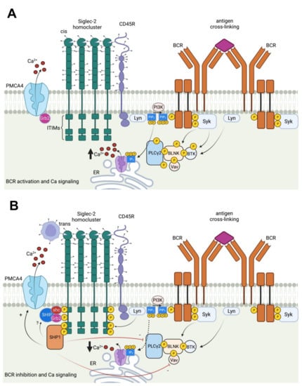 Activating and inhibitory pathways in Siglec-2 (CD22) as targets in cancer. (A) Antigen cross-linking of BCR results in an increase in cytosolic calcium in the B cells. Upon BCR stimulation, phosphorylation and activation of different BCR signaling complexes occur. Antigen binding is followed by the phosphorylation of ITAMs of Ig complex and PLCγ2 mediated production of signaling molecule, inositol-1,4,5-triphosphate (IP3). IP3 binds to IP3 receptor on the endoplasmic reticulum (ER) to release Ca2+ into the cytosol. Spleen tyrosine kinase (Syk) leads to increased phosphorylation of BTK-BLNK-PLCγ2-VaV complex in the calcium cascade, which releases more Ca2+ out of the ER. (B) Following BCR activation, cis or trans Siglec-2 recruitment inhibits BCR signaling and is phosphorylated by Lyn. There are six tyrosines in the intracellular tail of Siglec-2, out of which three are in the ITIMs. Two phosphorylated ITIMs can bind to tyrosine phosphatase SHP-1, which decreases the release of Ca2+ at the ER. Through the formation of quaternary SHIP-Grb2-Shc-CD22 complex, Ca2+ is further released through plasma membrane Ca2+ ATPase (PMCA, a calcium pump), to terminate calcium responses in the B cells after antigen stimulation.