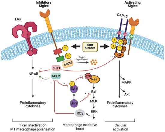 Siglec signaling and immune modulatory effect. Upon sialic acid binding, SRC kinases can phosphorylate tyrosine residues found in the cytosolic ITIM/ ITAMs. Within the inhibitory Siglecs, SHP-2 is recruited to the phosphotyrosines and can inhibit Sprouty (Spry). The inhibition of Spry promotes the activation of Ras-ERK signaling and subsequent ERK and Akt-dependent production of reactive oxygen species (ROS) [,]. ROS in sepsis can inactivate SHP-2, resulting in endothelial activation []. Additionally, SHP-2 can activate the NK-κB pathway, leading to inflammation and cellular immune responses []. On the other hand, SHP-1 inhibits the NK-κB pathway and controls cytokine production through the JAK-STAT pathway [,]. SHP-1 is associated with T cell inactivation, whereas SHP-2 is associated with the activation of M1 macrophage phenotype [,]. Suppressor of cytokine signaling 3 (SOCS3) competes with both SHP-1/-2 for phosphorylated ITIMs, thereby inhibiting signaling and resulting in accelerated proteosomal degradation of both Siglec-3 and SOCS3 []. Next, within the inhibitory Siglecs, DAP12 associates with the positively charged residue found in the transmembrane of inhibitory Siglecs. Subsequently, Syk bearing tandem SH2 domains binds to the phosphorylated ITAM-containing DAP12 [], and results in the downstream generation of second messenger, elevated intracellular calcium, and the activation of MAPK/Akt pathways. Notably, Syk can be inhibited by SHP-1 [], and thus modulate the activating and inhibitory signaling of Siglecs.
