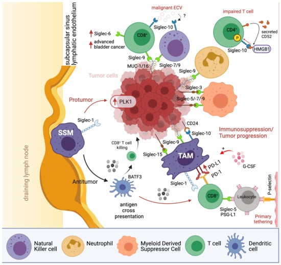 Siglec-1, also known as Sialoadhesin, is found only in macrophages, monocyte precursors, and mature dendritic cells. Due to its lack of any tyrosine-based signaling motifs, its predominant role is cell adhesion via high affinity ligand NeuAcα2-3Gal on N- and O-linked glycans and glycolipids []. Siglec-1 consists of one ligand-binding V-set domain and 16 C2-set domains, which extend its binding site away from the cell surface. Besides classical M1 or M2 type macrophage classification, a CD169+ macrophage subpopulation is found in the bone marrow, lymph node, liver, and spleen [,]. Despite the lack of a signaling motif, CD169+ macrophages still play multiple roles in cancer progression []. CD169+ macrophages represent a heterogeneous population including tumor infiltrating macrophages (TIMs) and tumor-associated tumor macrophages (TAMs) that can have anti- and pro-tumor functions, respectively. Besides TIMs and TAMs, sinus CD169+ macrophages in the tumor-draining lymph nodes are widely regarded in establishing antitumor immunity. Sinus CD169+ macrophages interact via cross-antigen presentation with basic leucine zipper ATF-like transcription factor 3 (BATF3)-dependent dendritic cells for the activation of CD8+ T cells [,]. Similarly, many studies have shown that abundant CD169+ macrophages in lymph nodes are positively correlated to the amount of CD8+ T cells in the tumor, and favorable patient overall survival (OS) in bladder cancer, colon cancer, gastric cancer, and malignant melanoma [,,,] However, Singh and Choi recently unraveled that sinus CD169+ macrophages can promote the survival of melanoma cells via mitotic polo-like kinase 1 (PLK1) phosphorylation at the subcapsular sinus region []. In comparison, CD169+ TIMs found in human hepatocellular carcinoma tissue are positively correlated with better patient’s OS but not non-tumoral CD169+ cells []. Conversely, CD169+ TAMs are immunosuppressive, and were recently shown to display elevated PD-L1 expression due to activated JAK2 driven by granulocyte colony-stimulating factor (G-CSF) level in triple-negative breast cancer []. Therefore, the inhibitory PD-L1/PD-1 axis may be exploited by breast cancer cells to escape immune surveillance, whereas CD169+ TAM depletion has shown infiltration of cytotoxic CD8+ T cells in the breast and lung tumor microenvironment [].