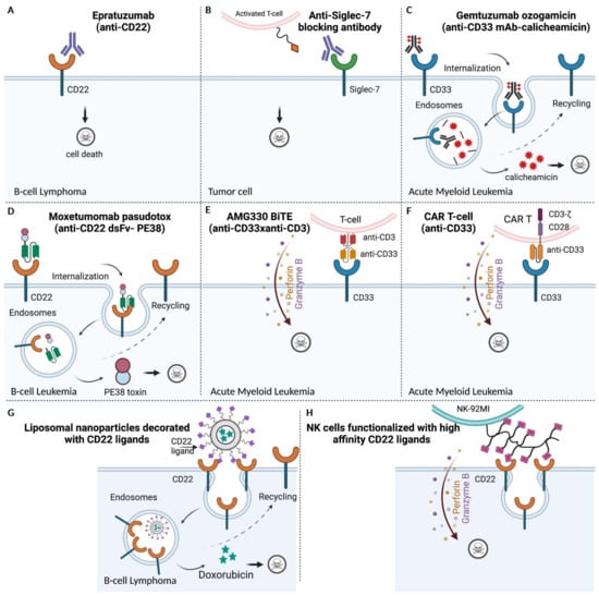Despite advances in standard chemotherapy and allogenic hematopoietic stem cell transplantation (alloHSCT), their associated non-specific toxicities and high mortality rates present obstacles for achieving durable remission in hematological malignancies. Monoclonal antibodies (mAbs) targeting Siglecs are an emerging alternative modality for passive immunotherapy to deplete tumor cells [,]. Traditionally, most mAbs mediate cell death via complement-dependent cytotoxicity (CDC) or antibody-dependent cellular cytotoxicity (ADCC) []. However, recent strategies target the immune effector cells to either enhance (bispecific antibodies) or re-direct (CAR-based cell transfer) their antitumor capabilities, and are discussed here [].