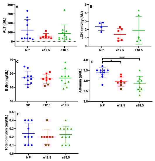 Biochemical markers of liver disease in NP, e12.5, and e18.5 BPH/5 mice (n = 8–15 per group). There was no significant difference in plasma levels of (A) alanine amino transferase (ALT), (B) lactate dehydrogenase (LDH), (C) blood urea nitrogen (BUN), (D) albumin, and total bilirubin (E) at any time point. * p < 0.01, *** p < 0.001, ns, not significant.