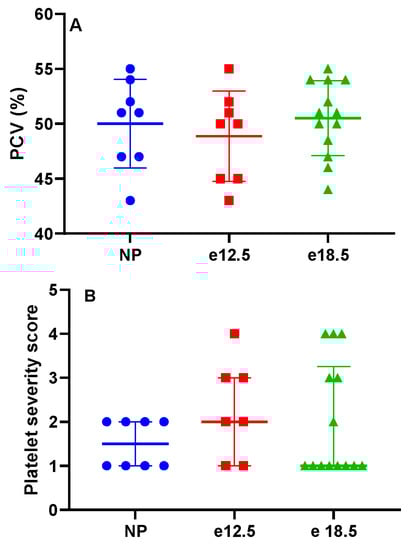 Clinicopathologic markers in NP, e12.5, and e18.5 BPH/5 mice (n = 8–15 per group). There was no evidence of (A) anemia or (B) progressive thrombocytopenia during pregnancy. Packed cell volume (PCV).