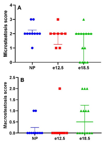 Histologically, there was no evidence of significant necroinflammatory liver disease at any time point before or during pregnancy. Inflammation was scored on a scale from 0 (no inflammatory infiltrate) to 3 (severe inflammation). NP BPH/5 had a mean score of 0, e12.5 mice had a mean score of 0.125, and e18.5 mice had a mean score of 0. The mean hepatic microsteatosis score was elevated at all time points (Figure 3A), and no significant difference was detected (p < 0.05). NP BPH/5 had a median score of 2 (IQR: 2–2.25), e12.5 mice had a median score of 2 (IQR: 1.25–2), and e18.5 mice had a median score of 2 (IQR: 0–2). The mean hepatic macrosteatosis score was elevated in late gestation (Figure 3B), and no significant difference was detected (p < 0.05). NP BPH/5 had a median score of 0 (IQR: 0–0.25), e12.5 mice had a median score of 0, and e18.5 mice had a median score of 0.5 (IQR: 0–1.25).