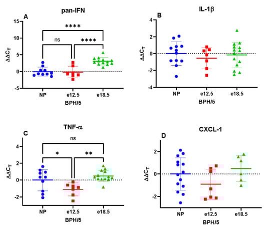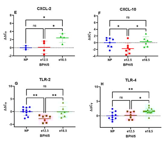 Transcriptional expression of hepatic inflammatory markers in BPH/5 mice preconception and at mid-late gestation (n = 7–15 per group). (A) Pan interferon (IFN) mRNA expression was significantly downregulated at e18.5, (B) Interleukin 1-beta (IL-1β) was unchanged during gestation, (C) Tumor necrosis factor-alpha (TNFα) expression was upregulated at e12.5, (D) C-X-C motif chemokine ligand-1 (CXCL-1) was unchanged during gestation, (E) C-X-C motif chemokine ligand-2 (CXCL-2) mRNA expression was significantly downregulated at e18.5, (F) C-X-C motif chemokine ligand-10 (CXCL-10) mRNA expression was significantly upregulated at e12.5, (G) Toll-like receptor-2 (TLR-2) transcription was significantly upregulated at e12.5, (H) Toll-like receptor-4 (TLR-4) expression was significantly downregulated at e18.5. * p < 0.05, ** p < 0.01, **** p < 0.0001 ns, not significant.