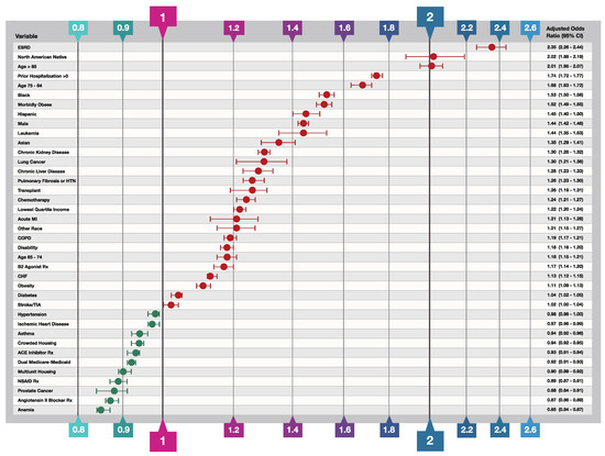 Logistic regression adjusted odds ratios identifying predictors of hospitalization and death at the individual level are presented in Figure 1 and Figure 2, respectively. The hospitalization model achieved an Area Under the Receiver Operating Characteristic curve (AUROC) of 0.66 (balanced accuracy 0.61 using threshold 0.50) while the death model achieved an AUROC of 0.71 (balanced accuracy 0.65 using threshold 0.50). Variables excluded from the models based on the specified selection criteria to remove insignificant variables are listed in the legends of Figure 1 and Figure 2.