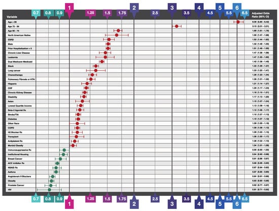 Predictor Variables for COVID-19-Related Death. The independent variable odds ratios were determined by binary logistic regression analysis of confirmed COVID-19 cases that survived versus those that died within 60 days of COVID-19 diagnosis. In addition to, the thirty-nine variables shown in the figure, the following variables were included in the model and survived the variable selection procedure described in Methods but are not shown: prescriptions filled with sufficient quantity to overlap the COVID-19 diagnosis date: Azithromycin (OR 1.18; 95% CI 1.13–1.23), chloroquine and hydroxychloroquine drugs (OR 1.22; 95% CI 1.13–1.23), unknown race (OR 0.88; 95% CI 0.80–0.96). Odds ratios for anemia and prescriptions for anticoagulant drugs and corticosteroids had regression coefficient p values > 0.05 and are not shown. Variables excluded from the model by the variable selection procedure include a history of colorectal cancer and endometrial cancer, or acute MI between July and December 2019, ischemic heart disease, hypertension, residence in zip codes in the top quartile of crowded housing or multiunit housing, and prescriptions for opioid drugs. NSAID Rx signifies treatment with a Non-Steroidal Anti-Inflammatory Drug.